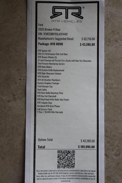***2025 Bronco Badlands RTR ROVR Edition 4WD SUV***RTR ROVR Upfit Package ($43,285)***Ford 334A Package Upgrade ($2,825)***Lux Package***12 LCD Center Stack Screen***Premium Sound System***FordPass Connect***Pre Collision Assist***Adaptive Cruise Control***Front & Rear Parking Sensors***360 Degree Camera***Rear Vision Camera***Push Button Start***Remote Start***Remote Keyless Entry***Dual Zone Electronic Climate Control***Serialized RTR Dash Plaque***Digital Instrument Cluster***Aux Switches w/Pre Wiring***Heated Leather Wrapped Multi Function Steering Wheel***Premium HD Vinyl Seating Surfaces w/Contrast Stitching & Bronco Seat Back Embossing***Heated Front Bucket Seats***60/40 Split Fold Rear Seat***Illuminated Entry***12V Power Points***Smart Charging USB Ports***Gray Molded Hard-Top Upgrade ($1,695)***Sound Deadening Headliner Upgrade ($495)***RTR Rock Sliders***RTR Spacer Lift***Fox 2.5 Performance Elite Coil Over***Front RTR Upper Control Arm Kit***RTR High Clearance Exhaust***Full Exterior Orange Paint Upgrade***RTR Custom Grille Replacement***HD Front & Rear Bumpers***RTR Roof Rack w/Molle Side Panels***RTR Tailgate Stop***RTR Rear Molle Mounting Plate***Front Bumper Cap***RTR Custom Graphics Package***LED Signature Lighting***Autolamp Headlamps***Auto High Beams***Roof Spotlights***Power Heated Door Mirrors***Rear Privacy Glass***Perimeter Alarm***4.46 Rear Axle Locking Diff***17 RTR Black Off-Road Wheels w/37 Tires***2.7L EcoBoost V6 Engine***10-Speed Auto Transmission***Lava Orange Paint***