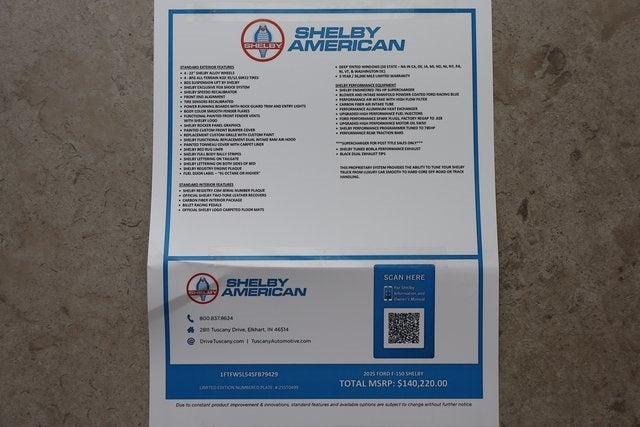 ***2025 F-150 Lariat Shelby Off-Road Edition 4WD Super Crew***5.0L V8 Supercharged 785HP Engine***Electronic 10-Speed Auto Transmission****Shelby Off-Road Edition Upfit Package ($65,220)***Ford 502A Package Upgrade ($7,725)***Lariat Black Appearance Package Upgrade ($1,250)***Twin Panel Moonroof Upgrade ($1,495)***SYNC 4 w/EVR & 12 Touchscreen***B&O Unleashed Sound System***FordPass Connect***Mobile Office Package***Wireless Charging Pad***Heads Up Display***BLIS w/Cross Traffic Alert***Lane Keeping System***Post Collision Braking***Pre Collision Assist***Reverse Brake Assist***Reverse Sensing System***360 Degree Camera***Rear View Camera***Adaptive Cruise Control***Intelligent Access w/Push Button Start***Remote Start***Remote Keyless Entry***Shelby Registry CSM Serial Number Plaque***Carbon Fiber Interior Accents***Power Adjustable Pedals***Billet Racing Pedals***Heated Leather Wrapped Multi Function Steering Wheel***Premium Perforated Shelby Exclusive Leather Seating Surfaces w/Red Contrast Stitching & Shelby Seatback Stitching***Heated/Cooled Front Bucket Seats***Power Driver & Passenger Seats***Heated Split Folding Rear Bench Seat***Ambient Lighting***Power Slide Rear Window***Power Deployable Running Boards***Shelby Engineered 785HP Supercharger***Blower & Intake Manifold Powder Coated Ford Racing Blue***Performance Air Intake w/High Flow Filter***Carbon Fiber Intake Tube***Performance Aluminum Heat Exchanger***Upgrade High Performance Fuel Injectors***Shelby Performance Programmer***Performance Rear Traction Bars***Shelby Borla Exhaust w/Black Finishers***BDS Suspension Lift By Shelby w/Shelby Exclusive Fox Shock System***Shelby Functional Dual Intake Ram Air Hood***Shelby Front Grille***Shelby Front Bumper***Body Color Front & Rear Bumpers***Functional Painted Front Fender Vents***Body Color Smooth Fender Flares***Shelby Rocker Panel Graphics***Shelby Full Blue Body Rally Stripe***Shelby Lettering On Both Sides Of Bed***Shelby Lettering On Tailgate***Daytime Running Lamps***LED Projector Headlamps w/Dynamic Bending Headlamps***Autolamp Headlamps***Auto High Beams***LED Fog Lamps***LED Taillamps***LED Side Mirror Spotlights***LED Bed Lighting***Shelby Bed Rug Liner***Painted Tonneau Cover***Power Heated Door Mirrors***Rear Privacy Glass***TPMS***Perimeter Alarm***3.73 Electronic Locking Axle Upgrade ($570)***22 Shelby Exclusive Black Alloy Wheels w/35 Tires***Oxford White Paint***